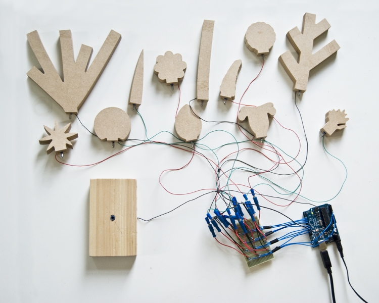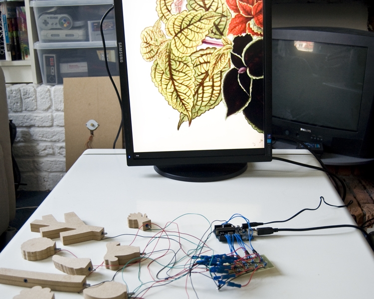 A prototype for a different way to browse the Biodiversity website (a website full of plant images). Instead of searching by topic or title, you use wooden shapes to build a plant. This is used as a filter for the database. For example: using a round flower will make the application show only images of that kind of flower. The display time of each image depends on the amount of search results; the lesser search results, the slower the images move by.