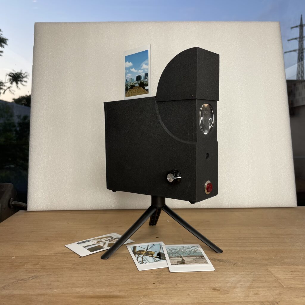 The Black Box Camera helps you take hassle free photos, without having to worry about exact framing, shutter speed or any other confusing settings. The user is presented with a simple, optical viewfinder which allows them to find their subject, after which a single button press starts the photo-taking process. The internal system uses a sophisticated machine learning algorithm to analyze the scene and to generate a descriptive caption. This caption serves as a prompt for a computer generated image, depicting your subject. The built-in photo printer then automatically prints the final result, making it a seamless and hassle-free experience.