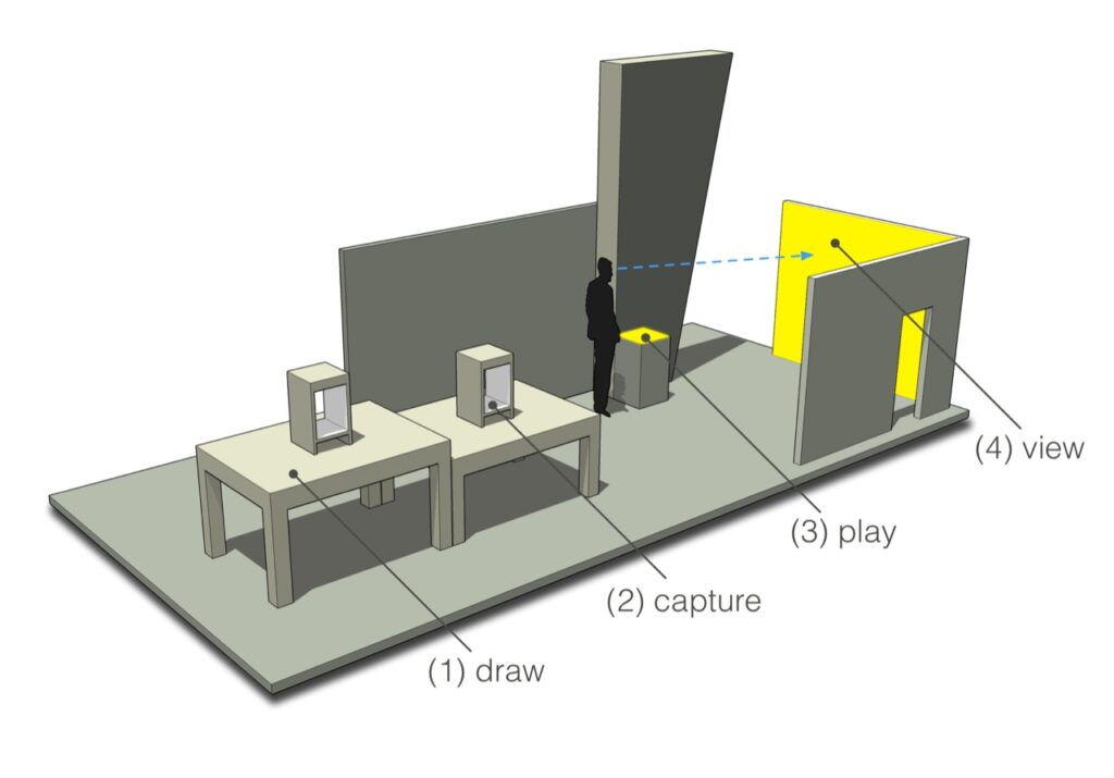 The installation uses a PC running Unity and a Node.js server, two Raspberry Pi’s with cameras attached and multiple iPads for input and feedback.