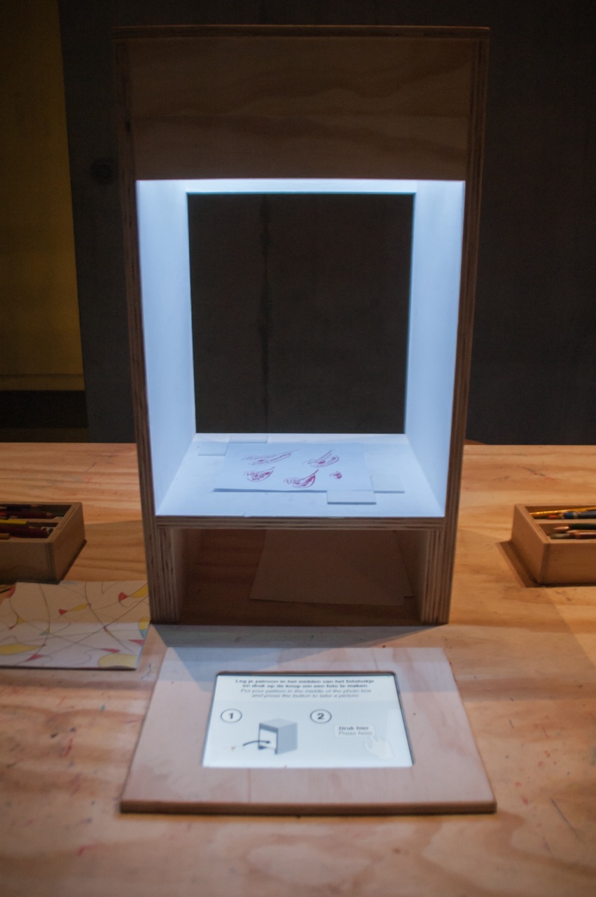 The installation was part of the exhibition ‘1:1 Sets for Erwin Olaf’ and the parallel exhibition ‘Bekleidung’, both based around interior design, lighting, and textures. Participants sit down at a large table to create their patterns and digitize them, after which the pattern gets projected onto a large wall, where they can fine-tune the pattern by scaling, rotating and turning on or off a series of virtual lights.