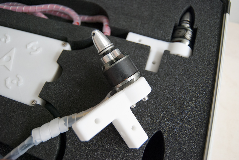 The plastic parts used for the version displayed have been 3D printed in ABS. The control unit contains a receiver, four ESCs, a bluetooth module and an OpenPilot CC3D flightcontroller.