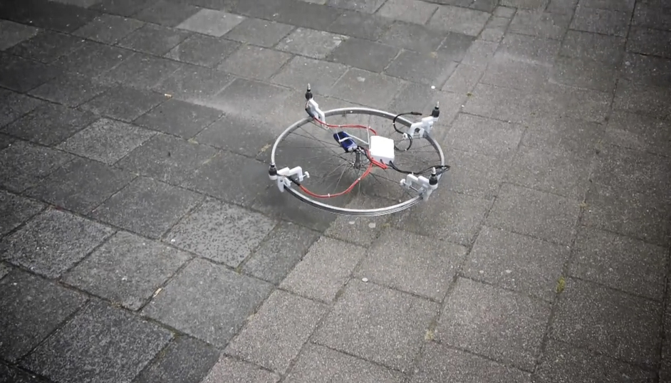 The DIY (Drone It Yourself) v1.0 kit was a response to the way drones were portrayed in the media at the time, with the term ‘drone’ being used for both small remote controlled toys, as well as military airplanes with a wingspan of 20 meters. At the time most people seemed to know this word from the news, and automatically so thought all drones were dangerous weapons. In reality, they are being used for many different applications, from finding lost hikers to keeping track of crops by farmers. This kit is meant to be a neutral piece of technology, offering the bare essentials needed to make something fly, which function is determined to the object it is connected to. Whether this is a camera, a machine gun or a bicycle wheel is up to the pilot.