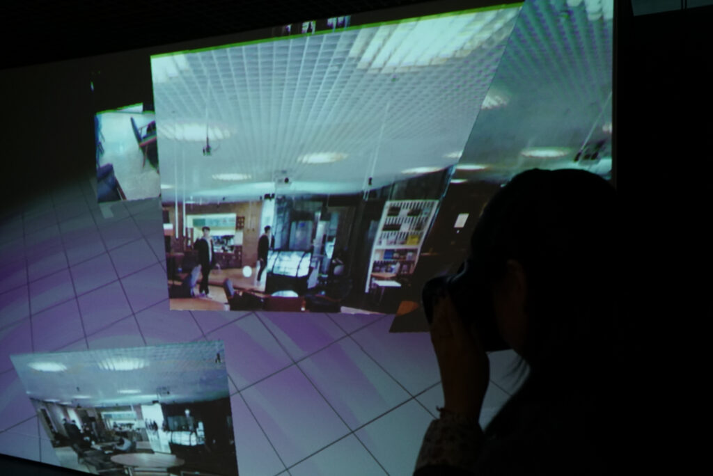 The second space, the virtual one, is in the main exhibition space of Nabi and took the form of a VR headset and projection. In the VR space the layout of the cameras is recreated using floating images. Each of these images is placed in such a way that it mimics the position and direction of one of the physical cameras and displays a live video stream. So by putting on the headset and looking around in VR you get to see what the cameras in the other space are filming at that very moment. By walking around in the VR space you get access to the space from different angles and positions.