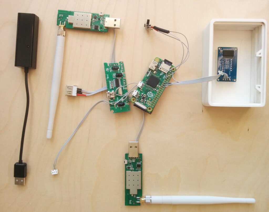- The device uses a 7-segment LED display, a Raspberry Pi Zero, two TL-WN722N Wifi dongles and a powered USB hub.