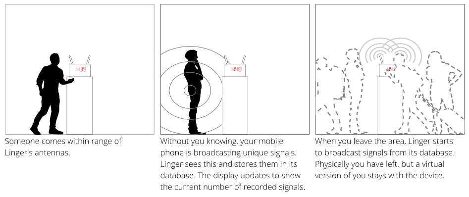 Linger is a small, portable device that allows you to create and blend into a virtual crowd by storing these specific wifi signals from everyone that comes near it, and rebroadcasting their signals infinitely when they’ve left, making it seem as if they are still there. As you pass people in the street and their signals are stored in the database the virtual crowd will keep expanding. A small display on the device automatically updates to show the number of unique individuals in your group.