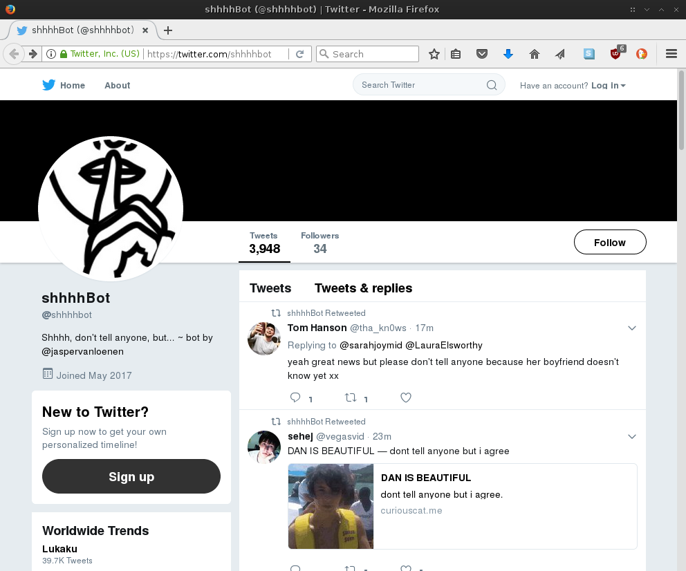 shhhhBot is a Twitter bot that, every ten minutes, searches for a tweet containing the text “don’t tell anyone, but” and retweets it.