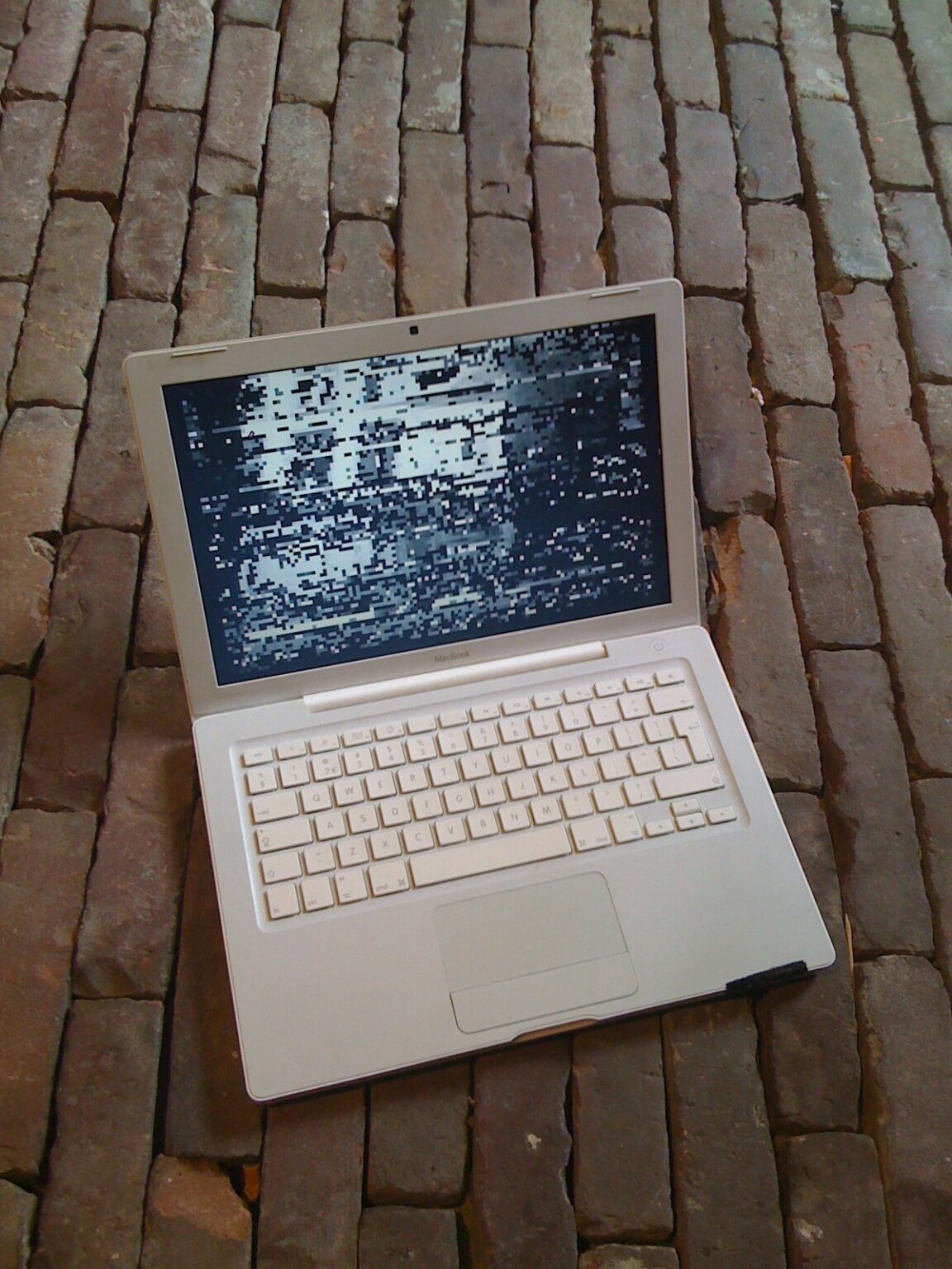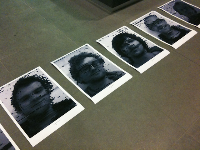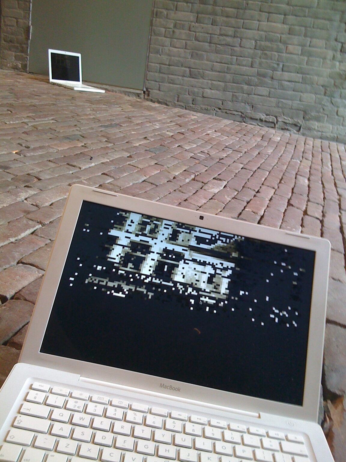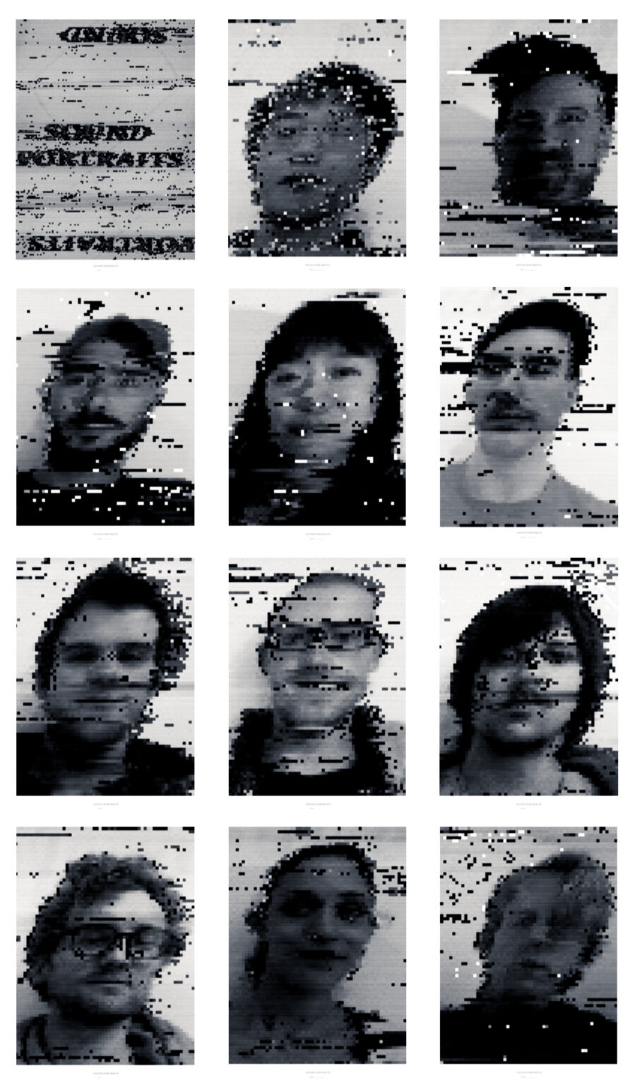 Each pixel in a low resolution black and white webcam image gets translated into a high-pitched sound, based on the brightness of the pixel. A second computer listens for this sound and translates the tones back to pixels. Generating one image takes about 6 minutes, during which you slowly see the image appear pixel by pixel. Things like ambient noise, echos in the space and participants not sitting still for the entire process introduce artifacts into the new image.
