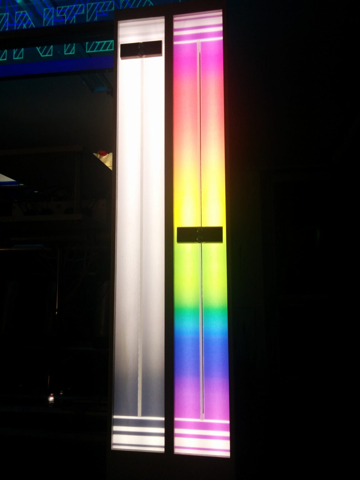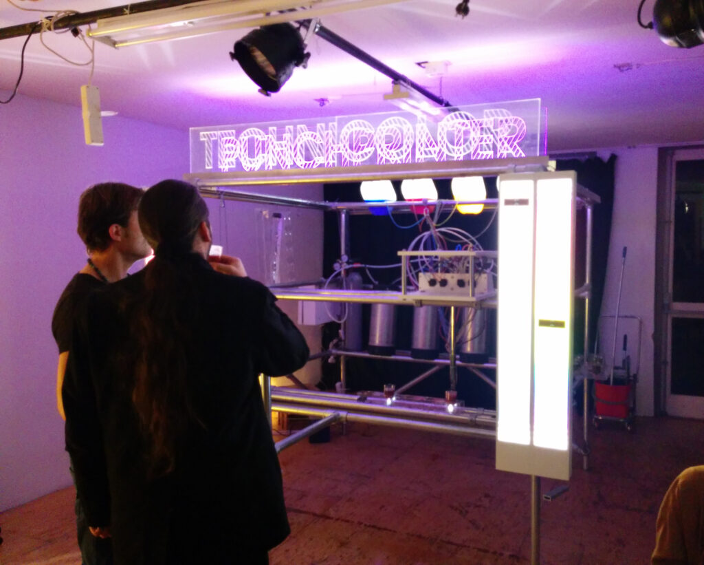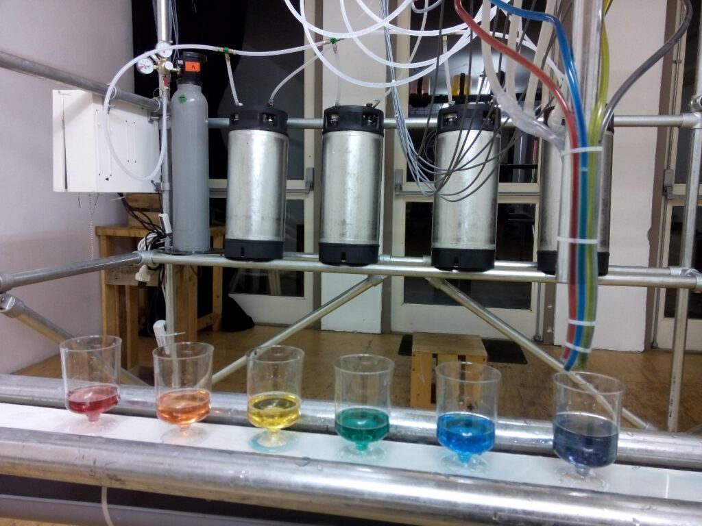 This 2x2x2 meter behemoth called the Technicolor Punch Printer lets you print up to ten glasses of colored (alcoholic) drinks. After selecting the start and end hue/brightness three participants have to work together to print a gradient of drinks.